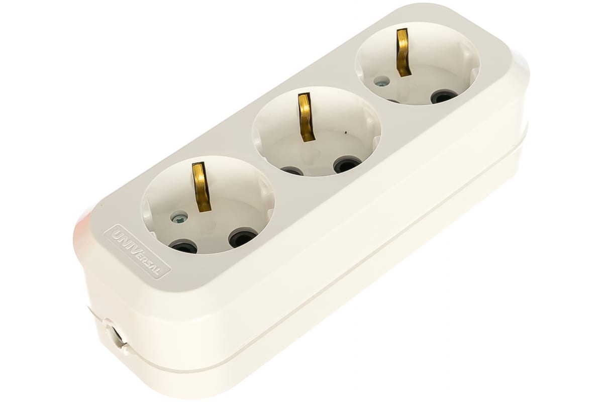 Колодка с заземлением, 3 гнезда, AБС-пластик UNIVersal E303 применяется для сбора удлинителя и подключения к стационарной розетке одновременно до трех бытовых электроприборов. Наличие заземляющих контактов обеспечивает повышенную электробезопасность соединений.Характеристики