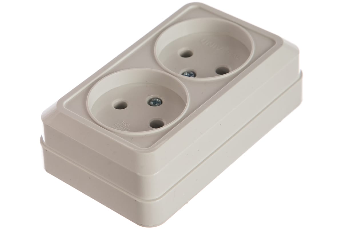 Двойная розетка без заземления, белая UNIVersal Олимп выполнена из АБС-пластика, имеет белый цвет корпуса. Идеально подойдет для монтажа в помещениях различного назначения (бытовые или промышленные). Розетка быстро и легко устанавливается накладным методом.Характеристики
