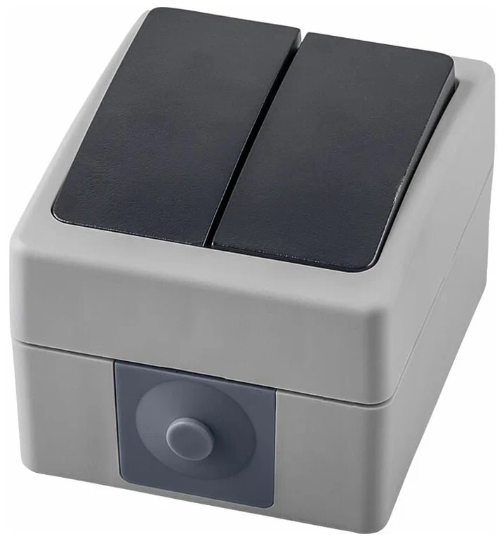 Выключатель двухклавишный серия Велена тип установки - открытый, цвет серый-графит, материал изделия Полипропилен, ABS пластик. Номинальное напряжение 250 , номинальный ток 10А, IP54.Характеристики
