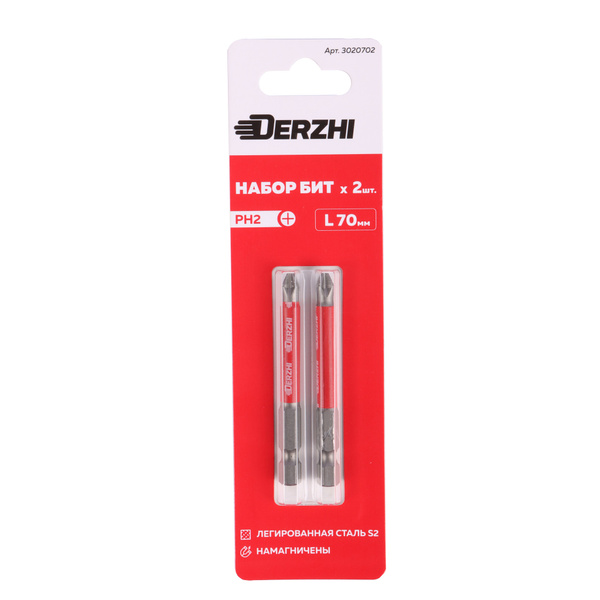 Набор бит Derzhi, PH2, 70 мм, 2 шт, легированная сталь S2, 3020702 предназначена для выполнения монтажных и демонтажных работ с помощью шуруповерта. Обеспечивает быстрый монтаж и демонтаж резьбовых соединений. С намагниченным наконечником.Характеристики