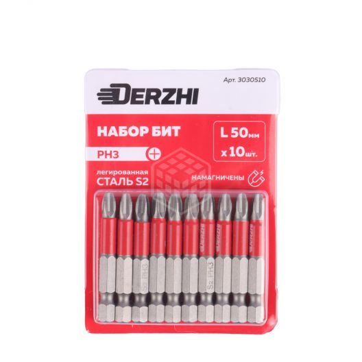 Набор бит Derzhi, PH3, 50 мм, 10 шт, легированная сталь S2, 3030510 предназначена для выполнения монтажных и демонтажных работ с помощью шуруповерта. Обеспечивает быстрый монтаж и демонтаж резьбовых соединений. С намагниченным наконечником.Характеристики