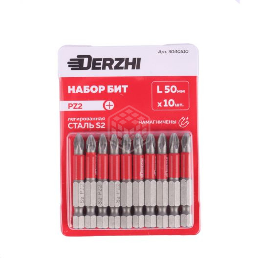 Набор бит Derzhi, PZ2, 50 мм, 10 шт, легированная сталь S2, 3040510 предназначена для выполнения монтажных и демонтажных работ с помощью шуруповерта. Обеспечивает быстрый монтаж и демонтаж резьбовых соединений. С намагниченным наконечником.Характеристики