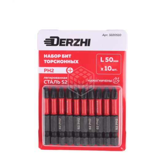 Набор торсионных бит Derzhi, PH2, 50 мм, 10 шт, легированная сталь S2, 3220510 предназначена для выполнения монтажных и демонтажных работ с помощью шуруповерта. Обеспечивает быстрый монтаж и демонтаж резьбовых соединений. С намагниченным наконечником.Характеристики