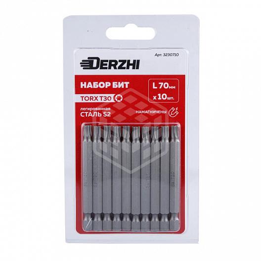 Набор бит Derzhi, TORX T30, 70 мм, 10 шт, сталь S2, 3230710 предназначен для выполнения монтажных и демонтажных работ с помощью шуруповерта. Обеспечивает быстрый монтаж и демонтаж резьбовых соединений. С намагниченным наконечником.Характеристики