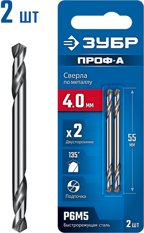 - Сверло по металлу двустороннее ЗУБР Профессионал 4,0*55мм, сталь Р6М5,класс А 29627-4,0