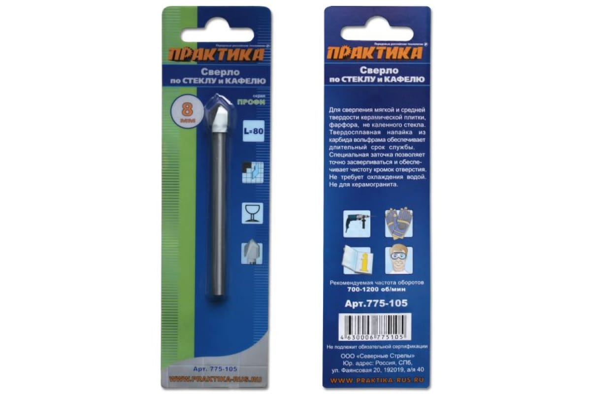 - Сверло по стеклу ПРАКТИКА "Профи" V-тип 8х80мм