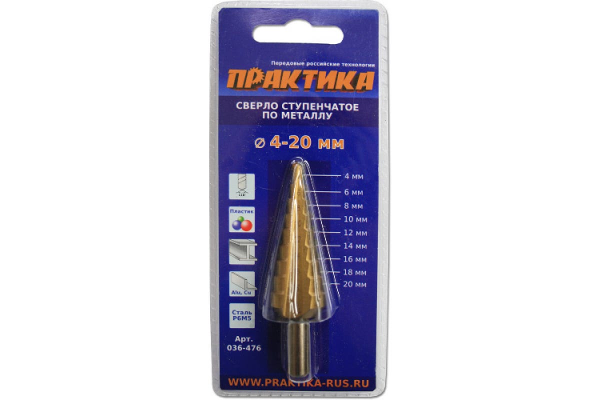 - Сверло по металлу ступенчатое ПРАКТИКА 4-20мм шаг 2мм TIN