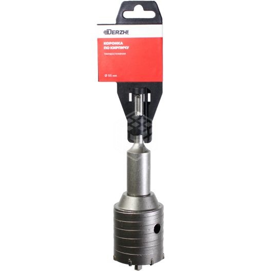 Коронка по кирпичу Derzhi, в сборе, 55 мм представляет особой специальный элемент оснастки для перфораторов с патроном SDS-plus и служит для выполнения сверлильных работ в кирпичных основаниях. В частности, коронка используется в целях создания довольно глубоких отверстий соответствующего диаметра (55 мм). Инструмент имеет несколько резцов из карбида вольфрама и имеет центрирующее сверло с твёрдосплавным наконечником, которое позволяет повысить точность сверления. Корпус коронки и хвостовика изготовлен из прочной легированной хромом стали 40Cr, отличающейся довольно высокой износоустойчивостью. Изделие поставляется в составе коронки с посадочным размером М22 и держателя с хвостовикомХарактеристики