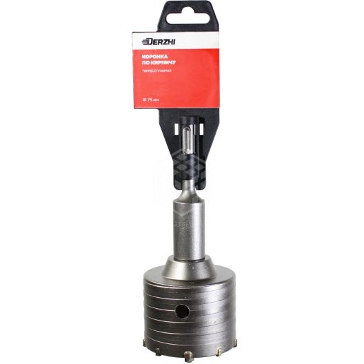 Коронка по кирпичу Derzhi, в сборе, 75 мм предназначена для использования с перфораторами, предусматривающими наличие патрона SDS-plus. Данная принадлежность служит для осуществления сверлильных работ в кирпичных основаниях, и, в частности, - создания довольно глубоких отверстий соответствующего диаметра (75 мм). В качестве рабочего сегмента в инструменте выступают специальные резцы, выполненные из карбида вольфрама и закреплённые на корпусе при помощи высокотемпературного припоя. Конструкцией предусмотрено также центрирующее сверло с твёрдосплавным наконечником, которое позволяет повысить точность сверления и облегчить вхождение в материал. Корпус коронки и хвостовика изготовлен из прочной легированной хромом стали 40Cr, отличающейся весьма высокой износоустойчивостью. В комплекте поставляется коронка с посадочным размером М22 и держатель с хвостовиком SDS-plus.Характеристики