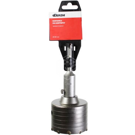 Коронка по кирпичу Derzhi, в сборе, 80 мм отлично подходит для применения с перфораторами, предусматривающими наличие патрона SDS-plus. Данная принадлежность служит для осуществления сверлильных работ в кирпичных основаниях, и, в частности, - создания довольно глубоких отверстий соответствующего диаметра (80 мм). В качестве рабочего сегмента в инструменте выступают специальные резцы, выполненные из карбида вольфрама и закреплённые на корпусе при помощи высокотемпературного припоя. Конструкцией предусмотрено также центрирующее сверло с твёрдосплавным наконечником, которое позволяет повысить точность сверления и облегчить вхождение в материал. Корпус коронки и хвостовика изготовлен из прочной легированной хромом стали 40Cr, отличающейся весьма высокой износоустойчивостью. В комплекте поставляется коронка с посадочным размером М22 и держатель с хвостовиком SDS-plus.Характеристики
