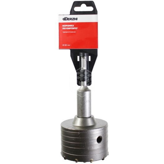 Коронка по кирпичу Derzhi, в сборе, 85 мм предназначена для сверления отверстий соответствующего диаметра (85 мм) в кирпичных основаниях. В качестве рабочего сегмента в инструменте выступают специальные резцы, выполненные из карбида вольфрама и закреплённые на корпусе при помощи высокотемпературного припоя. Конструкцией приспособления предусмотрено центрирующее сверло с твёрдосплавным наконечником, которое позволяет повысить точность сверления и облегчить вхождение в материал. Корпус коронки и хвостовика изготовлен из прочной легированной хромом стали 40Cr, отличающейся весьма высокой износоустойчивостью. В комплекте поставляется коронка с посадочным размером М22 и держатель с хвостовиком SDS-plus.Характеристики
