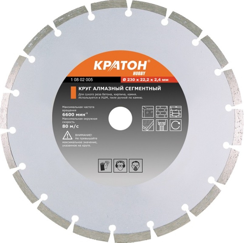 Круг алмазный сегментный Кратон предназначен для сухого реза бетона, кирпича, камня с помощью угловой шлифовальной машины.Характеристики