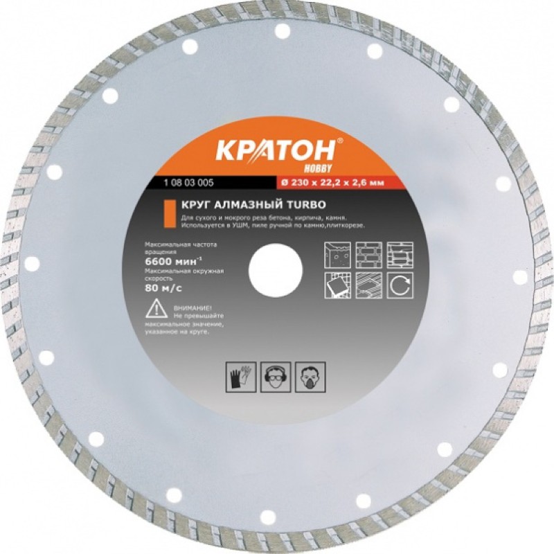 Круг алмазный TURBO HOBBY Кратон предназначен для сухого и мокрого реза бетона, кирпича, камня. Имеет турбированную рабочую поверхность, что обеспечивает высокую производительность.Характеристики