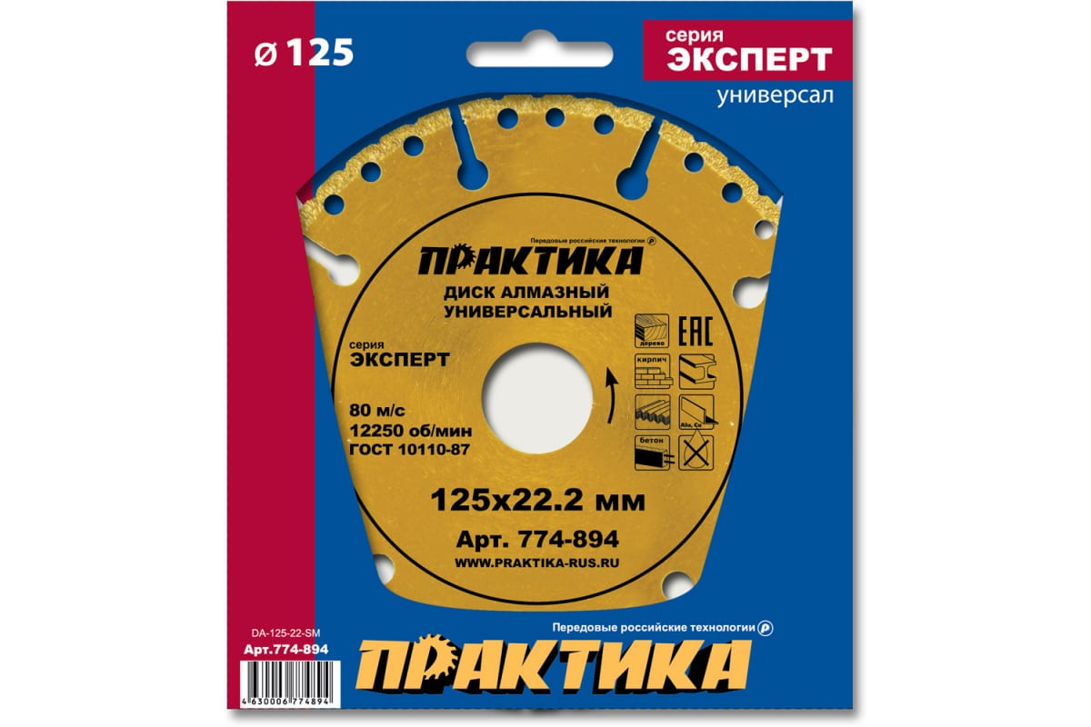Диск алмазный сегментный Эксперт-Универсал (125х22.2 мм) ПРАКТИКА 774-894 предназначен для ручных резчиков. Применяется для сухой резки любых материалов от абразивных (асфальт, силикатный кирпич) до металлических профилей и дерева. Вентилируемая конструкция тела диска обеспечивает воздушное охлаждение и предотвращение перегрева. Идеально подходит для пиления материалов неоднородного состава: армированный бетон, перекрытия крыши с деревянной или металлической обрешеткой, перегородки с профилями и наполнителями, вскрытия полов. Рекомендован в качестве спасательных работ для оперативного вскрытия металлических дверей, перегородок крыш, пиления твердых металлических изделий: замков, стержней, пальцев, пружин, валов, дверных петельХарактеристики