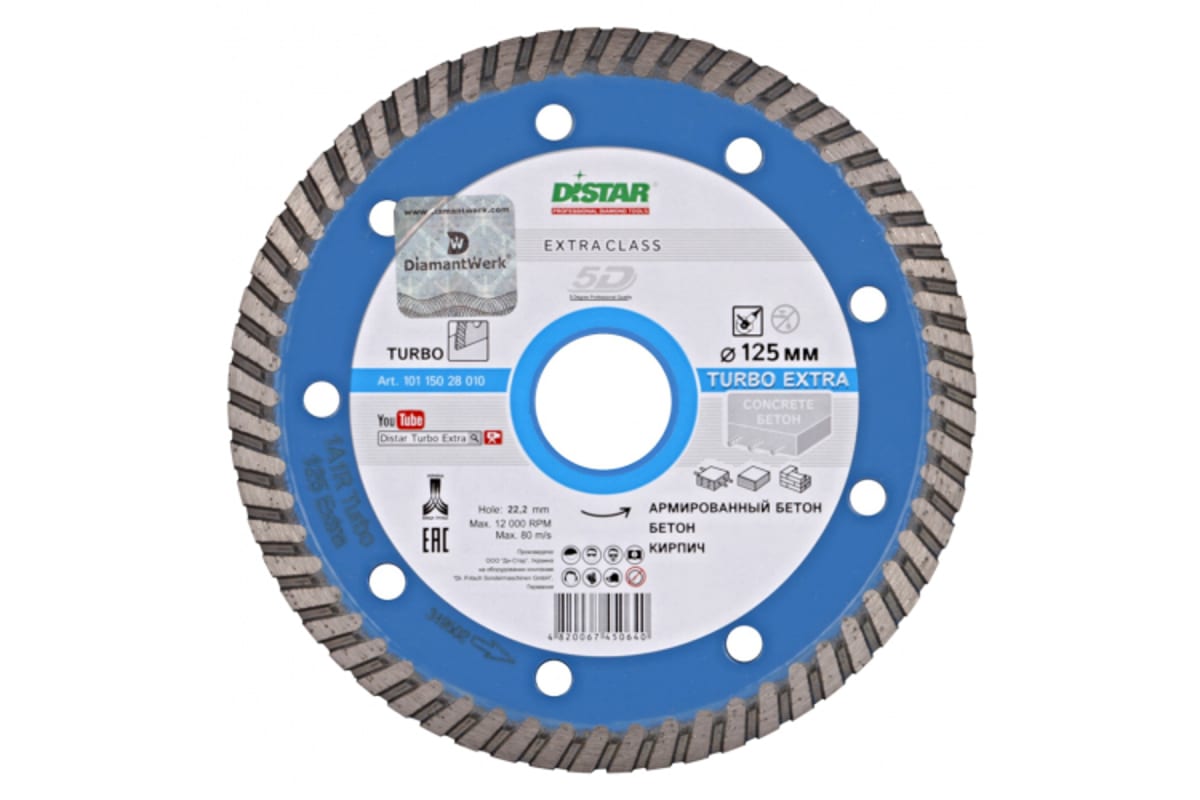 Диск алмазный турбо Extra DiStar 10115028010 предназначен для угловых шлифовальных машин и ручных резчиков. Применяется для сухой резки армированного бетона, кирпича, бордюрного бетона, песчаника и тротуарной плитки. Высота алмазного слоя – 8 мм.Характеристики