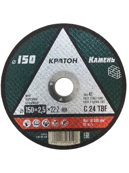 Круг отрезной C 24 TBF Кратон относится к типу абразивных изделий. Модель оснастки подходит для работ с различными типами камня. Применяется с болгарками имеющими посадочный шпиндель 22,2 мм. Диаметр диска составляет 15 см при высоте 2,5 мм. Эти параметры определяют ширину и скорость разреза заготовки. Высокая режущая способность и стойкость позволяют использовать круг в профессиональной работе с изделиями из камня: столешницами, плиткой из керамогранита. Особенности Абразив используемый в изделии имеет зернистость 24. Абразивный материал. Армированная сетка укрепляет абразивные частицы. Структура круга является безопасной и препятствует разлетанию элементов абразива в процессе работы. Преимущества Корунд в качестве абразива позволяет достигнуть высокой степени твердости круга. Бакелит в качестве связующего элемента придает прочность и устойчивость.Характеристики