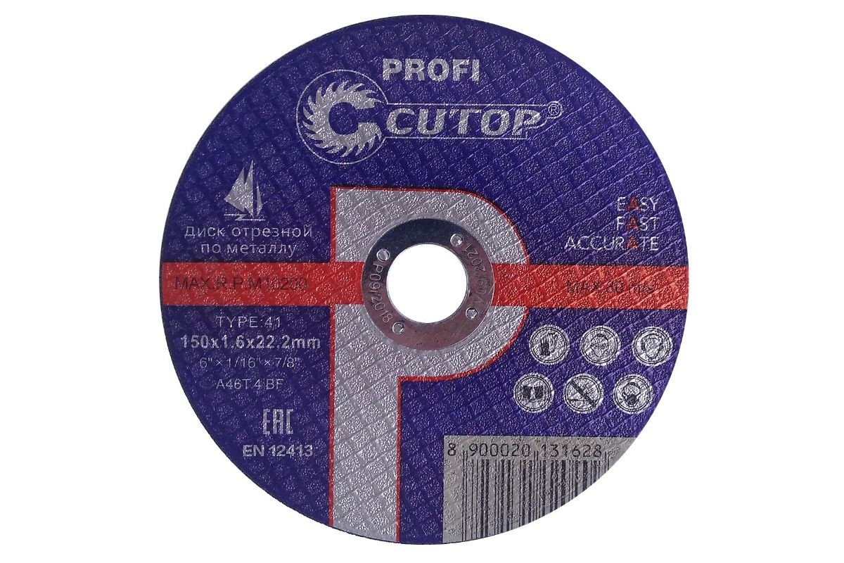 Профессиональный диск отрезной по металлу и нержавеющей стали Cutop Profi Т41-150 х 1,6 х 22,2 мм Профессиональный отрезной диск по металлу и нержавеющей стали на основе монокристали- ческого электрокорунда, который улучшает КПД диска и позволяет увеличить количество резов в несколько раз. Для углошлифовальных машин. Посадочный диаметр 22.2 мм.Характеристики