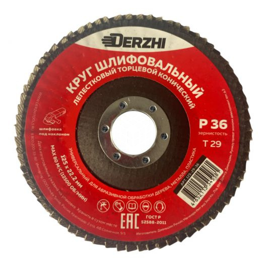 - Круг DERZHI лепестковый торцевой конический 125*22,2мм, зерно Р36