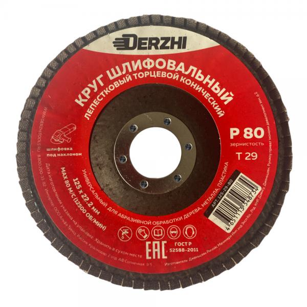 - Круг DERZHI лепестковый торцевой конический 125*22,2мм, зерно Р80 125-29-80