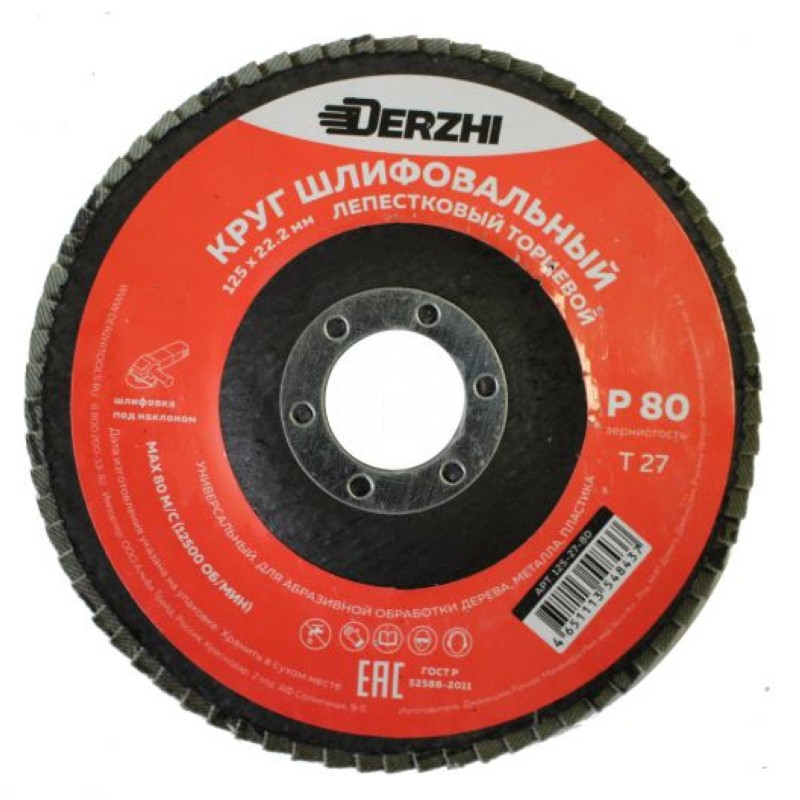 - Круг DERZHI лепестковый торцевой конический 125*22,2мм, зерно Р80