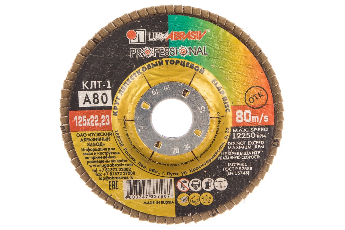 Круг лепестковый торцевой Луга-Абразив 3656-125-80 используется совместно с угловыми шлифмашинами для торцевого и плоского шлифования изделий из металла, дерева, пластмассы, зачистки сварных швов и заусенцев, снятия ржавчины и т.д. Круг изготовлен на гибкой основе, имеет высокую производительность и износостойкость. Безопасность соответствует требованиям ГОСТ 52588-2011 И EN 13743.Характеристики