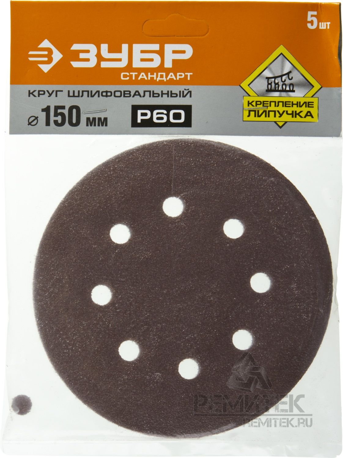 - Круг шлифовальный ЗУБР "СТАНДАРТ" из абразивной бумаги на велкро основе, 6 отв, Р60, 150мм, 5шт
