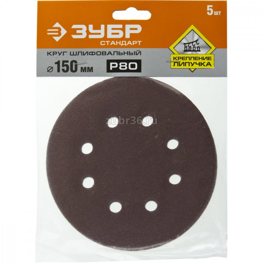 - Круг шлифовальный ЗУБР "СТАНДАРТ" из абразивной бумаги на велкро основе, 6 отв, Р80, 150мм, 5шт