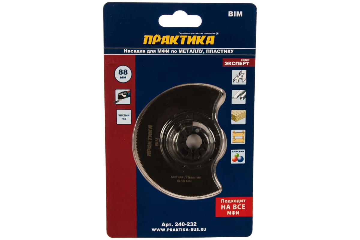 - Насадка для МФИ ПРАКТИКА отрезная полукруг, BiM, по металлу и дереву, 88 мм, мелкий зуб 240-232