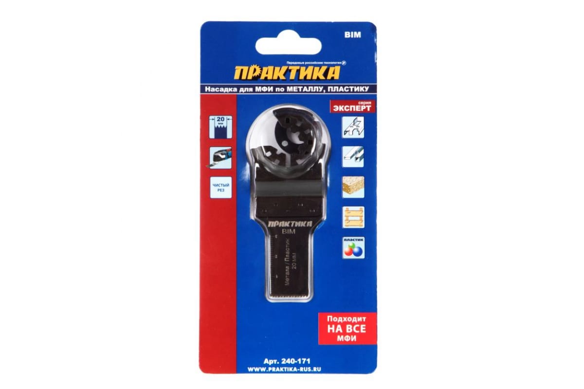- Насадка для МФИ ПРАКТИКА режущая пазовая прямая, BiM, по металлу и дереву, 20 мм, мелкий зуб 240-171