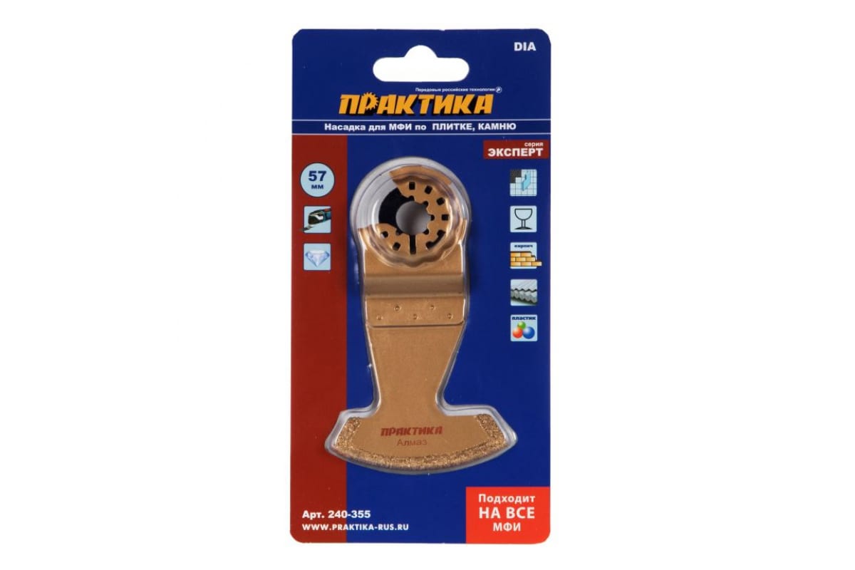Насадка для МФИ по камню и плитке (57 мм) ПРАКТИКА 240-355 используется совместно с многофункциональным инструментом. Применяется для обработки мягкой и средней твердости плитки, керамики, стекла, плиточных швов, кирпича и стеклопластиков. Насадка изготовлена из инструментальной стали с алмазным напылением. Глубина реза - 40 мм.Характеристики