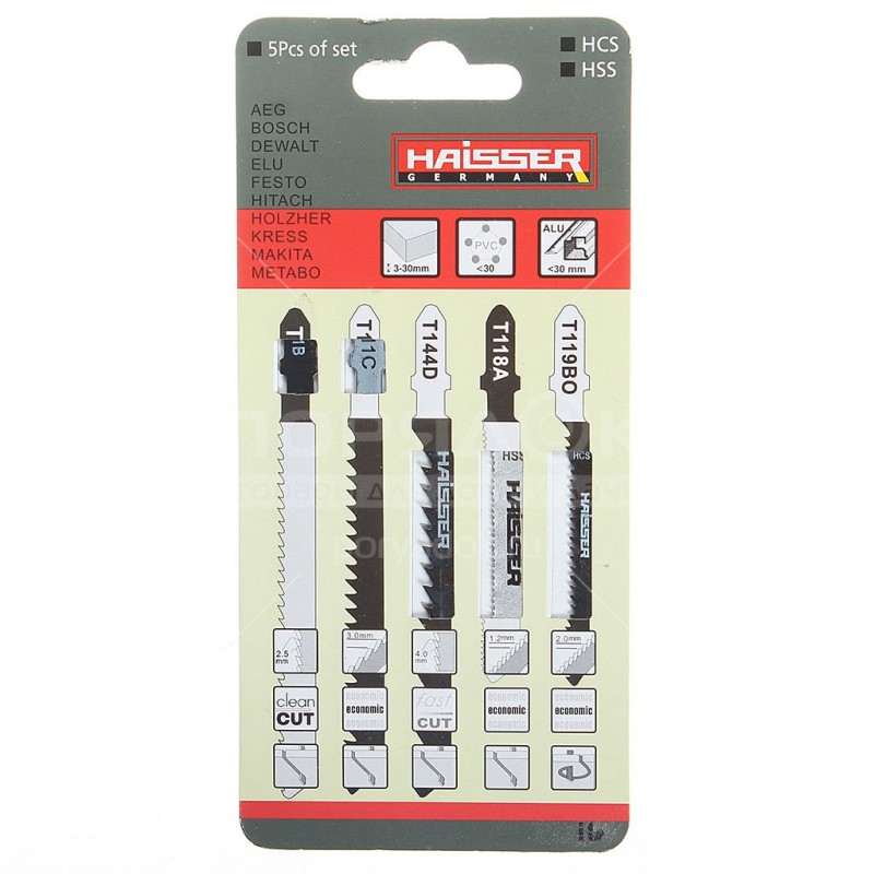 Набор Haisser HS118029 включает в себя пять пилок для электролобзика. Они изготовлены из высокоуглеродистой стали, имеют фрезерованные зубья и волнистое полотно, что гарантирует высокое качество исполняемой работы. Применение Пилки Haisser HS118029 подходят для работы с электролобзиками AEG, Bosch, Dewalt, Festo, Hitachi, Holzher, Kress, Makita, Metabo и других марок. Пилки предназначены для разрезания тонкой стали, алюминия и цветных металлов.Характеристики