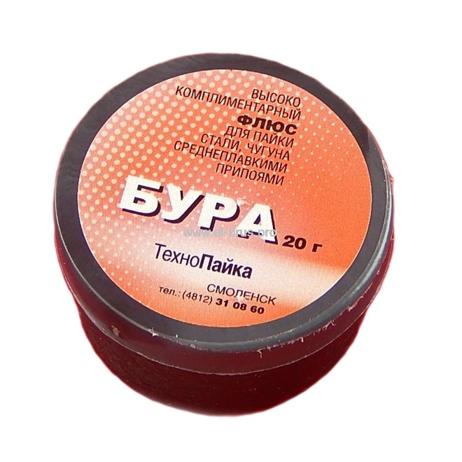 Флюс для пайки БУРА предназначен для удаления оксидов с поверхности под пайку, улучшения растекания жидкого припоя при пайке углеродистых сталей, чугуна, меди и её сплавов медно-цинковыми и серебряными припоями. Представляет собой порошок белого, светло-серого или подобных оттенков цвета, и позволяет осуществлять сплавление обычных металлов с благородными посредствам газопламенного нагрева. Является самым распространенным флюсом, который используется для пайки ювелирных украшений из золота, серебра, мельхиораХарактеристики