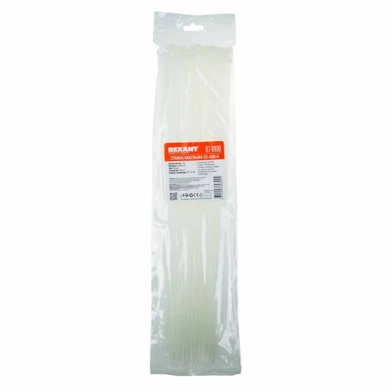 Хомут нейлоновый (кабельная стяжка) 400х4,8 мм белый REXANT предназначен для крепления или обвязки в жгут кабелей и проводов, крепления гибких гофротруб, а также других предметов к несущей поверхности или для соединения между собой. Такая стяжка используется при проведении электромонтажных работ, при монтаже структурированных кабельных систем, для бытовых нужд, а также в других отраслях народного хозяйства.Характеристики