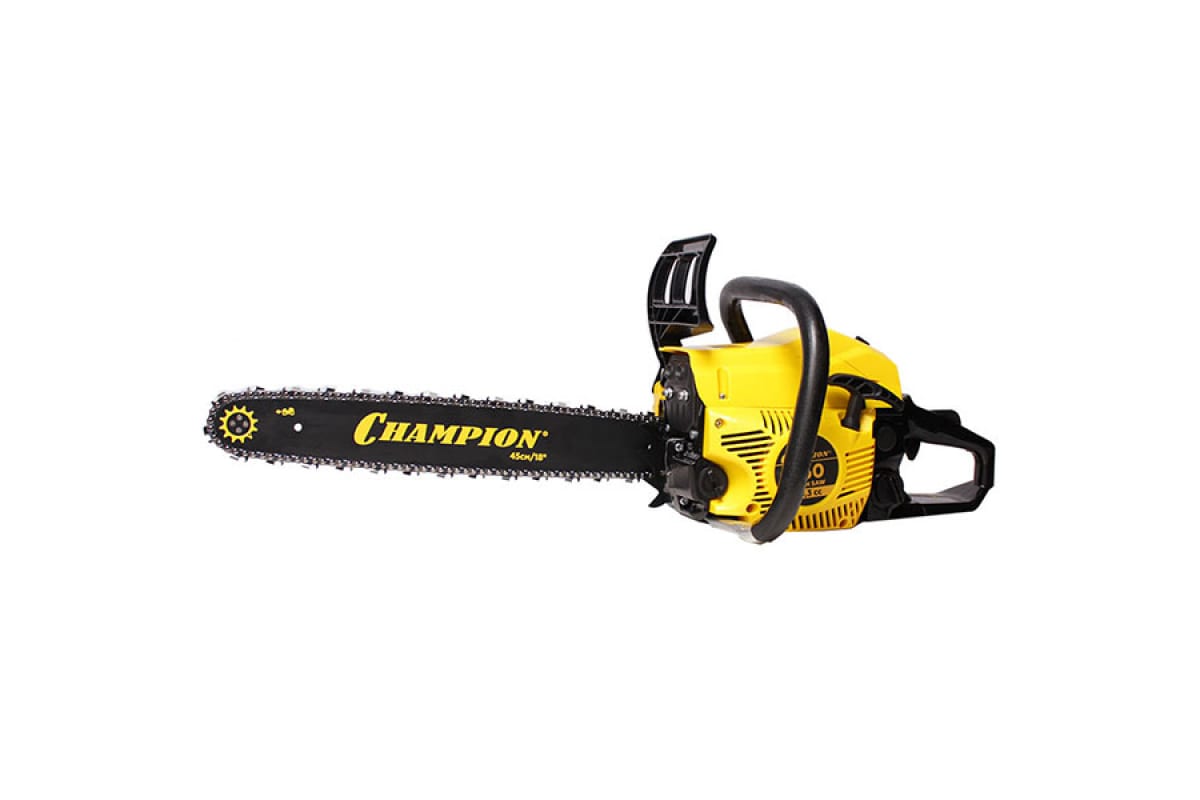 Бензопила Champion 350-18" - устройство для валки деревьев и распиливания древесины. Мощный двигатель обеспечивает быстрое выполнение поставленных задач за счет высоких оборотов. За повышение безопасности отвечают уловитель и тормоз цепи, снижающие вероятность травмы оператора при отскоке инструмента или обрыве цепи.Характеристики