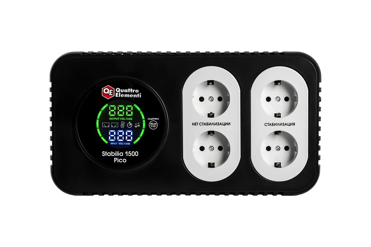 - Стабилизатор напряжения настольный QUATTRO ELEMENTI Stabilia 1500 Pico (1500ВА,160-280В) 917-742