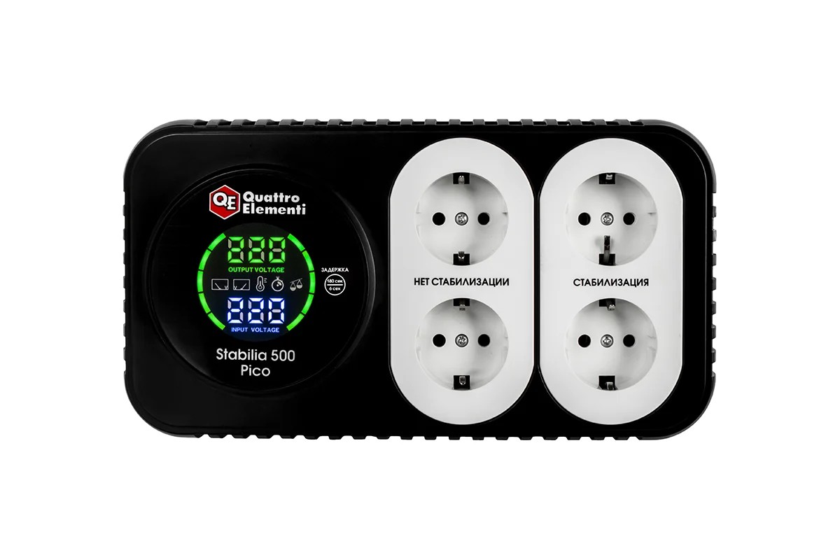 - Стабилизатор напряжения настольный QUATTRO ELEMENTI Stabilia 500 Pico (500ВА,160-280В) 917-728