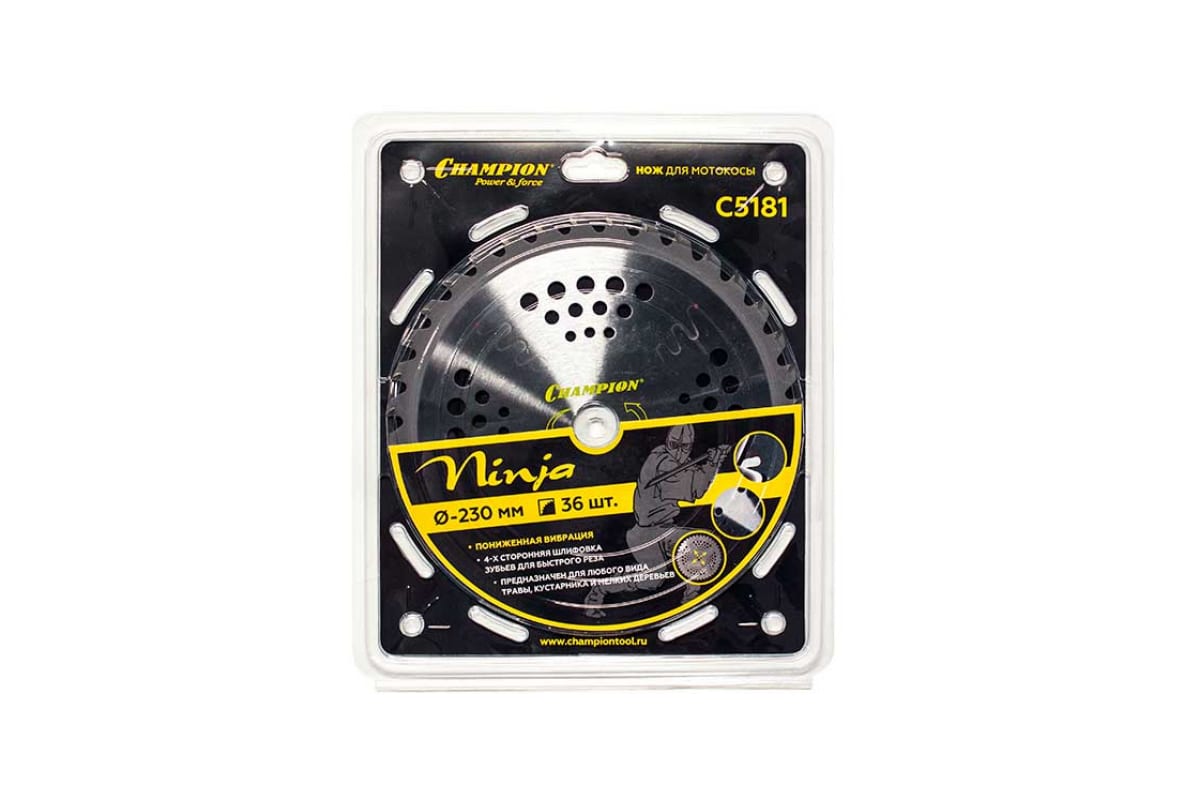 Нож с зубцами из твердого сплава Ninja (36 зубьев, 230х25,4 мм) CHAMPION C5181 подходит для работы с профессиональными триммерами SRM-2305SI,SRM-2655SI. Без труда срезает жесткую траву, тонкие деревья и кустарники.Характеристики