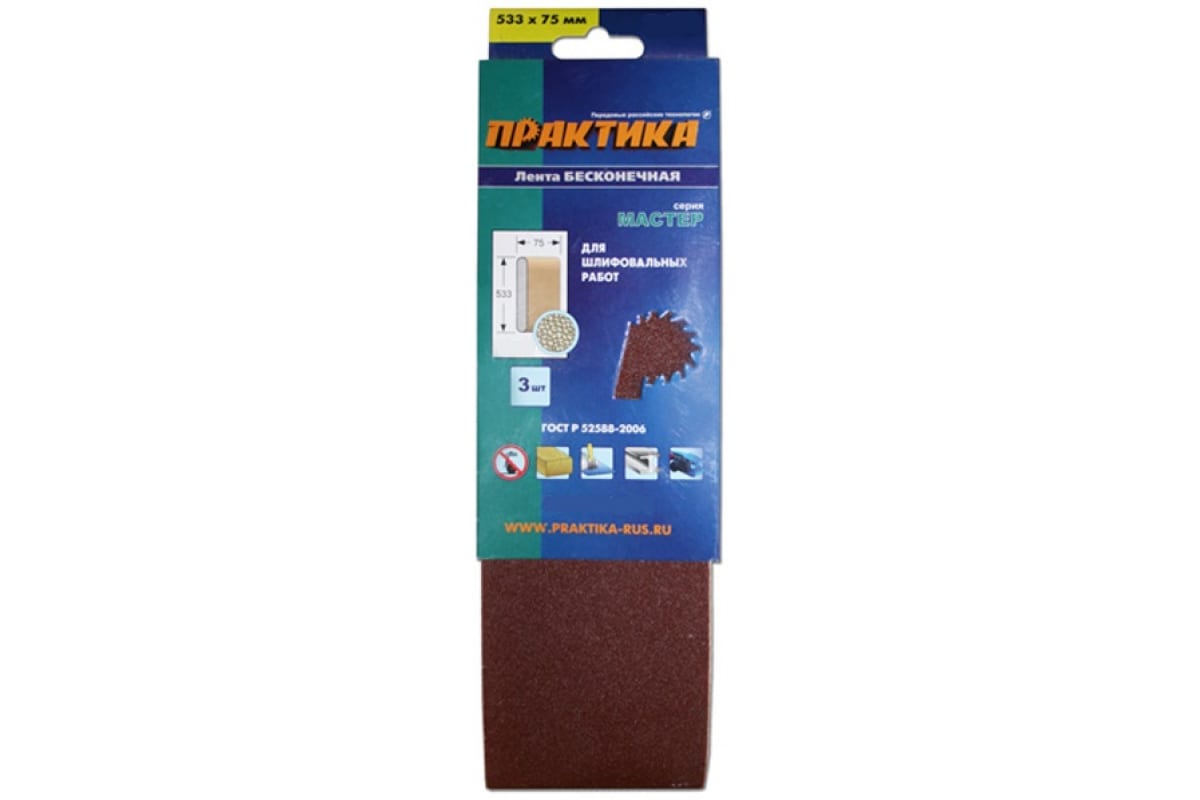 Лента шлифовальная Практика 031-471 - это комплект, состоящий из трех изделий для ленточных шлифовальных машин. Благодаря длине и ширине, равным 533 и 75 мм соответственно, представленная модель может использоваться с подавляющим большинством шлифовальных электроинструментов. Шлифовальная лента Практика 031-471 с универсальным назначением обладает степенью зернистости P-150, что подтверждает возможность ее использования для окончательной шлифовки мягких пород дерева и снятия старой краски для дальнейшей покраски.Характеристики