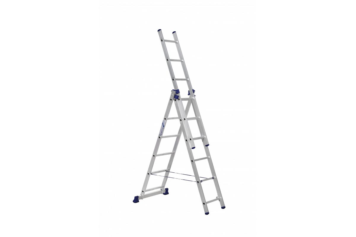Трехсекционная универсальная алюминиевая лестница Алюмет - это многофункциональное приспособление для разных работ. Может использоваться в приставном варианте, как двухсекционная лестница, а так же в качестве стремянки и в виде раздвижной, телескопической конструкции. Комплектуется страховочными ремешками, что повышает безопасность работ. Двухкомпонентные наконечники, которыми оснащены опоры, защищают лестницу от скольжения во время работы.Характеристики