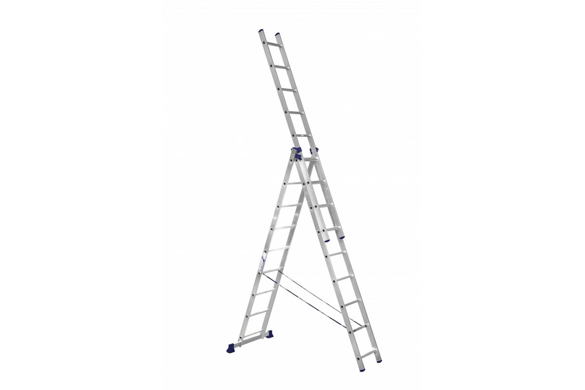 Трехсекционная универсальная алюминиевая лестница Алюмет Серия H3 5309 - это многофункциональное приспособление для разных работ. Может использоваться в приставном варианте, как двухсекционная лестница, а так же в качестве стремянки и в виде раздвижной, телескопической конструкции. Комплектуется страховочными ремешками, что повышает безопасность работ. Двухкомпонентные наконечники, которыми оснащены опоры, защищают лестницу от скольжения во время работы.Характеристики