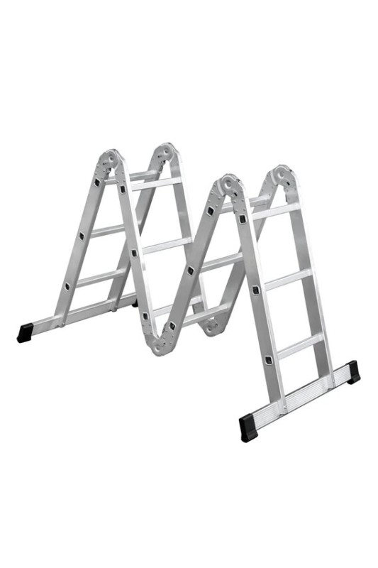 Предназначена для бытового и профессионального использования. Состоит из четырех секций, соединенных между собой шарнирными механизмами. Каждая из секций данной лестницы имеет по 3 ступени.Конструкция лестницы-трансформера позволяет использовать ее и как приставную лестницу, и как обычную стремянку, и как подмости.Прочное крепление ступеней к боковинам придает конструкции высокую жесткость. Небольшие габариты облегчают хранение изделия.Характеристики