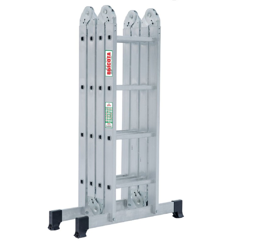 Четырёхсекционная шарнирная лестница по четыре ступени в секции предназначенa для проведения строительных, монтажных, ремонтных и эксплуатационных работ на высоте до 4,77 м. Оптимальна для работ в ограниченном пространстве.Характеристики