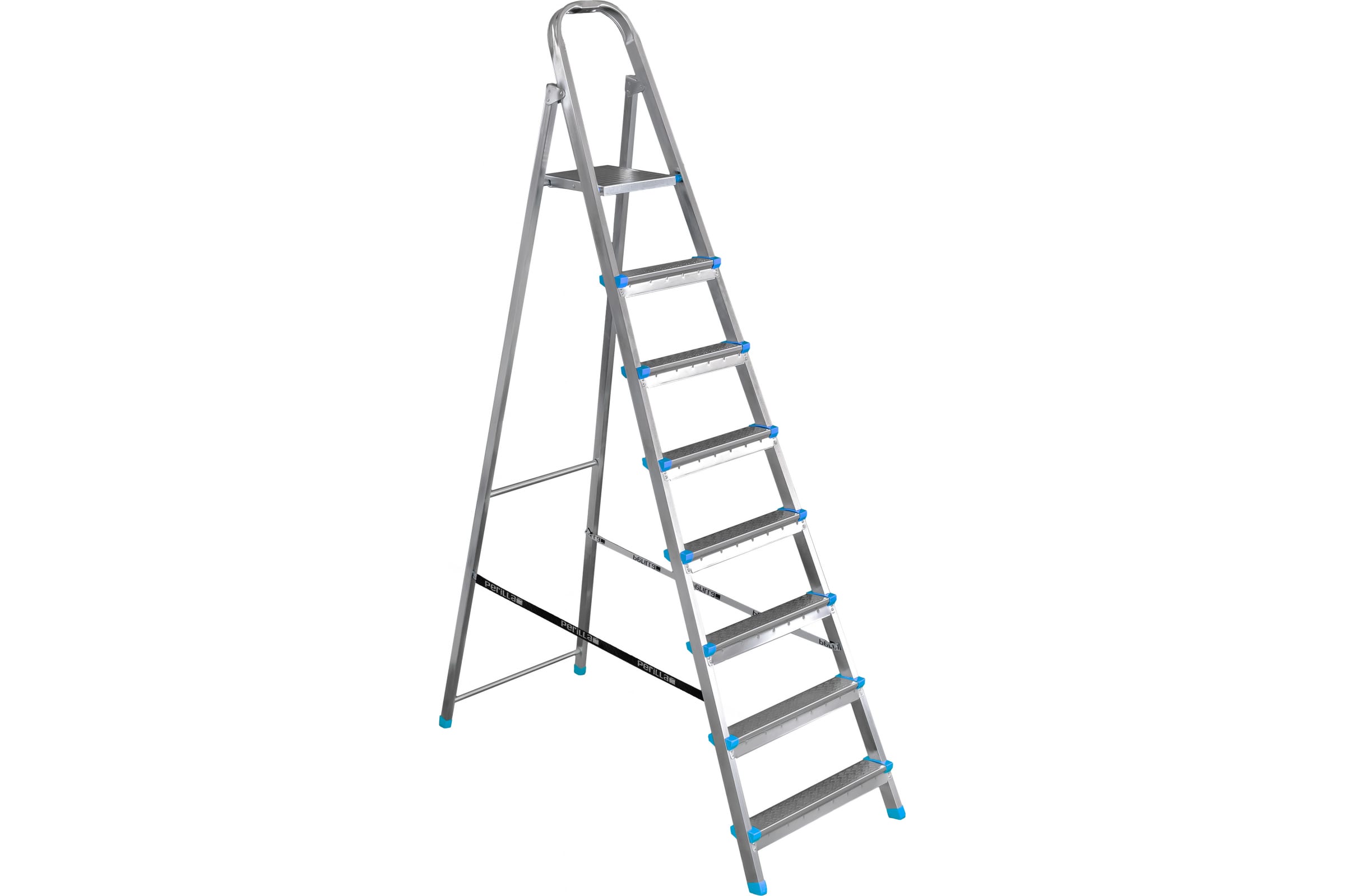 Стремянка стальная 8 ступеней с гальваническим покрытием, изготовлена из прямоугольного профиля, ступени стремянки рифленые, что позволяет подниматься и спускаться по ним безопасно, на боковых поферхностях тсупеней имеются накладки из пластика.Характеристики