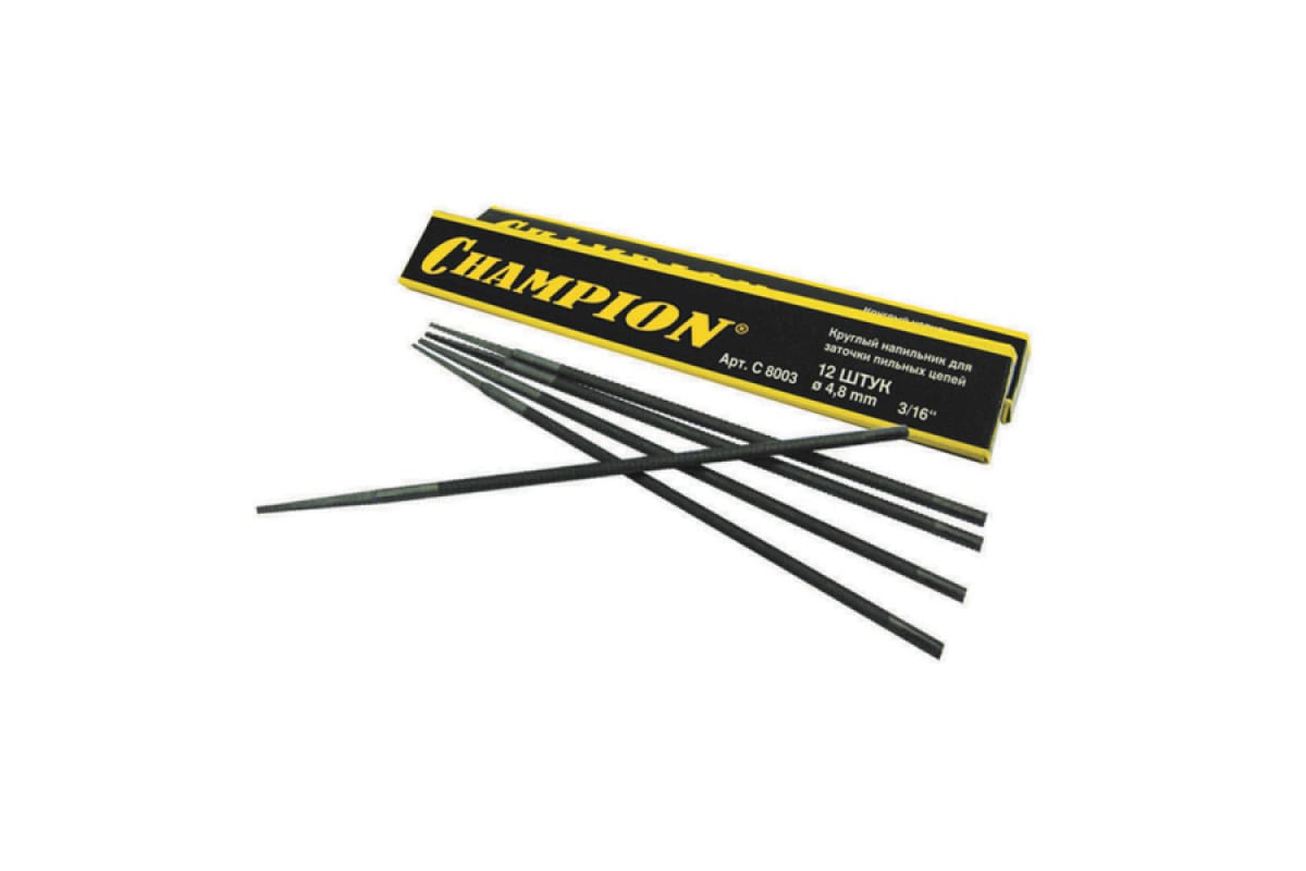 Напильник 4,8 CHAMPION имеет круглое сечение. Применяется для обработки граней цепей с шагом 3/16 дюйма. Предусмотрено совместное использование с рукояткой, которая приобретается, исходя из предпочтений пользователя.Характеристики