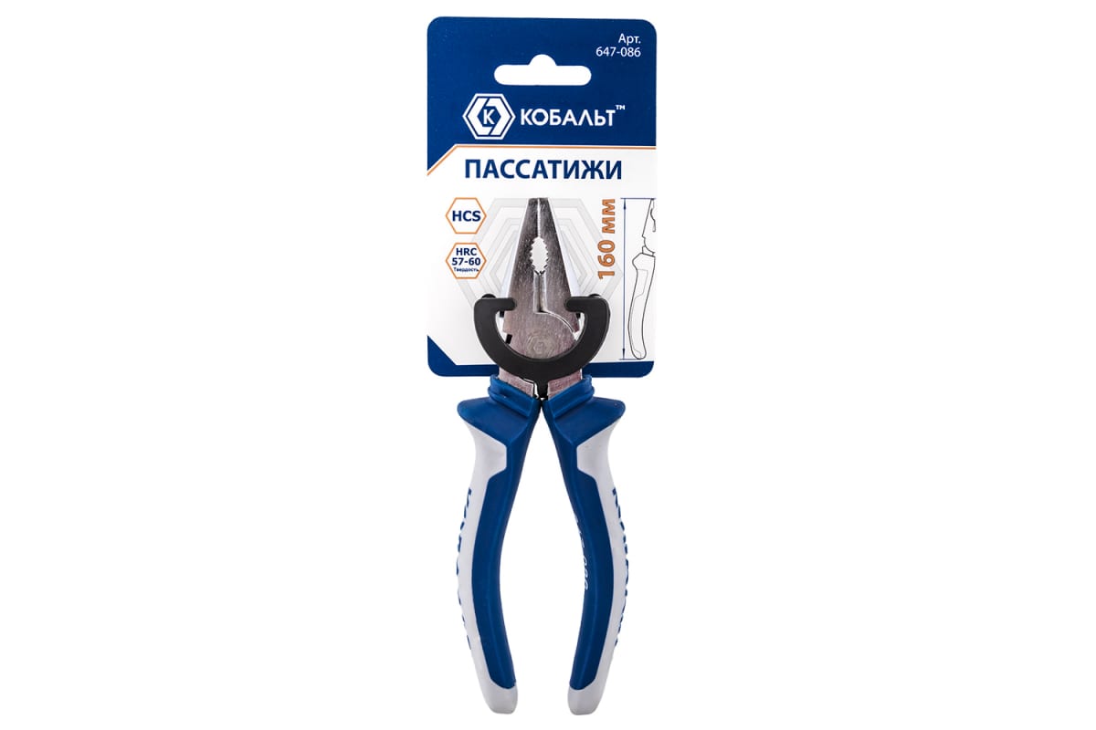 Пассатижи 160 мм CR-V КОБАЛЬТ 647-086 - инструмент, который применяется и для захвата предметов, и для резки проволоки. Губки пассатижей выполнены из хром-ванадиевой стали с твердостью 57 - 62 HRC. Они прошли термическую обработку, что гарантирует долгую службу. Эргономичная форма рукоятки обеспечивает крепкий захват во время использования.Характеристики