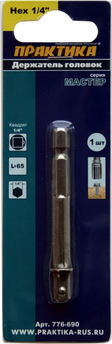 - Адаптер ПРАКТИКА квадрат 1/4" для головок, длина 65 мм, хвостовик шестигранник 1/4"
