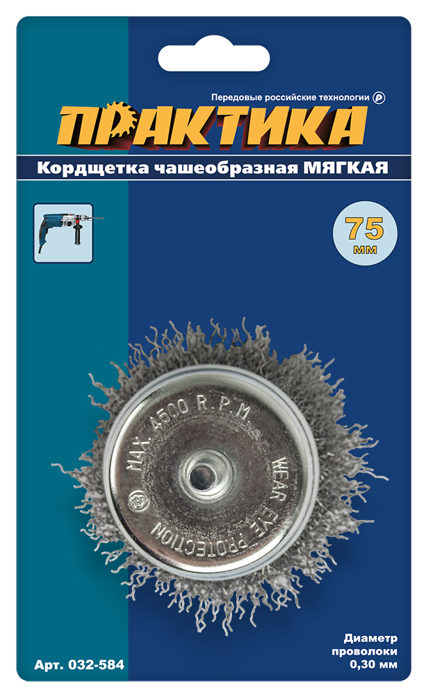 - Кордщетка для дрели чашеобразная мягкая ПРАКТИКА 75 мм, хвост 6 мм