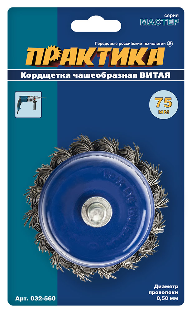 - Кордщетка для дрели чашеобразная витая ПРАКТИКА 75 мм, хвост 6 мм