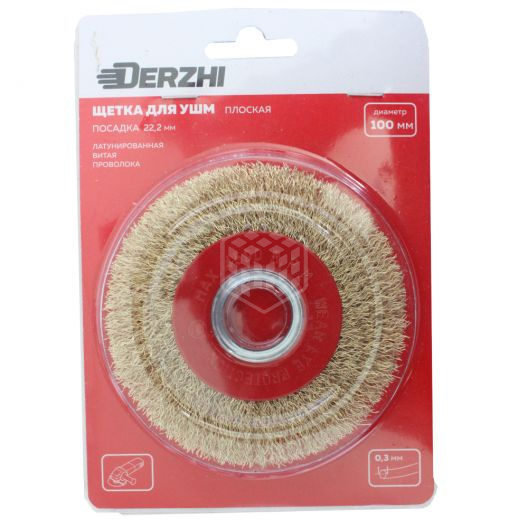 - Щетка DERZHI для УШМ, плоская 100 мм посадка 22,2мм латунированная витая проволока 874648