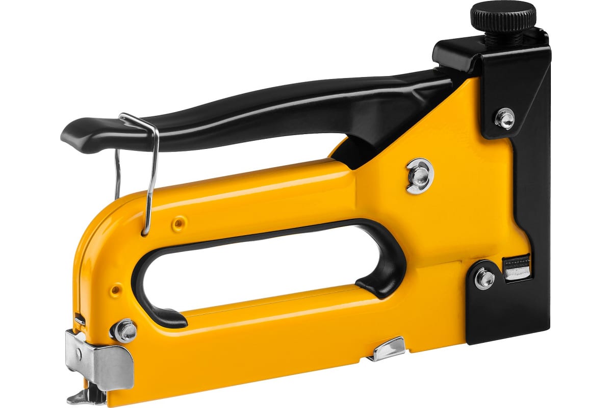Стальной степлер STAYER Max-53 тип 53, 31501 используется для легкого и быстрого скрепления между собой различных материалов (например, ткани и дерева/пластика или дерева и дерева). Изделие выполнено из цельного металла. Есть возможность регулировки силы удара при помощи специального винта. В качестве расходных материалов используются скобы типа 53, красные, размером 4-14 мм.Характеристики